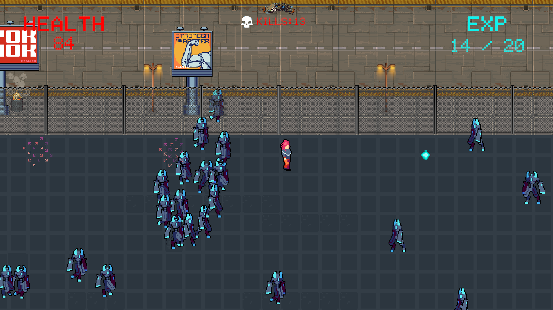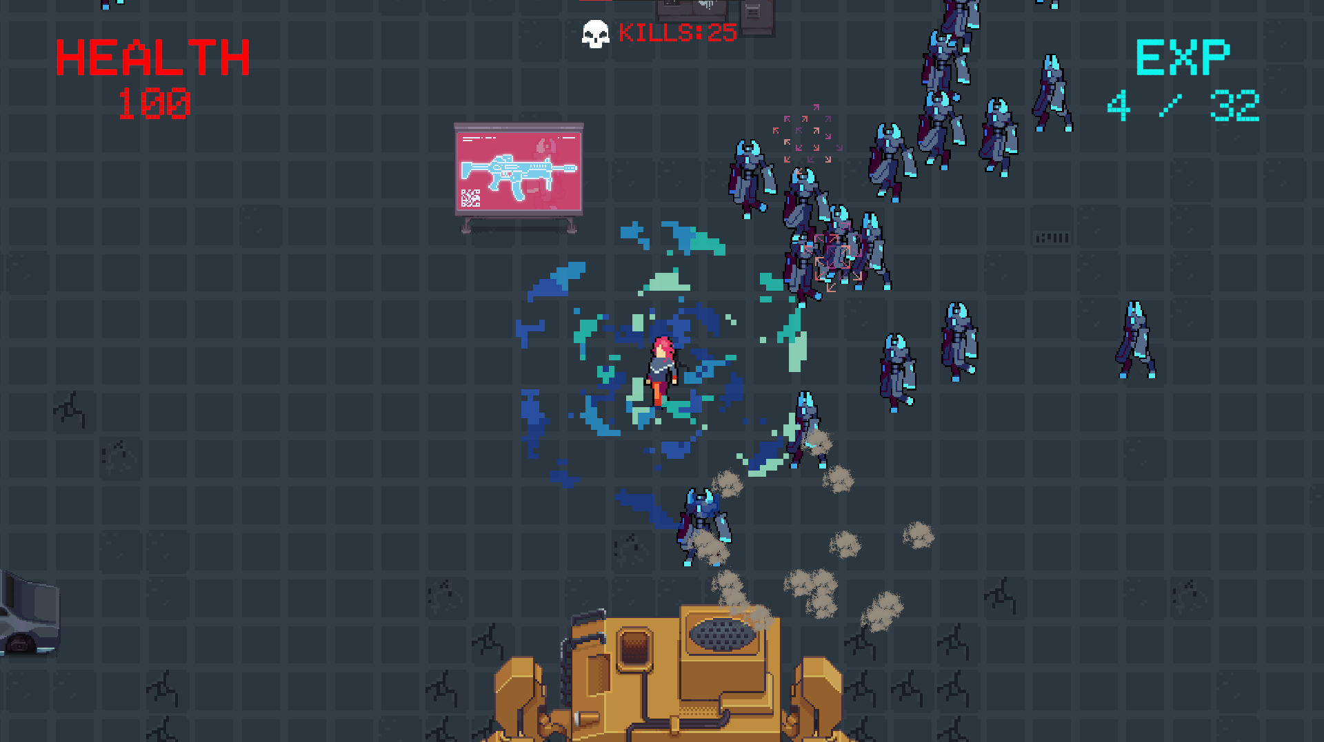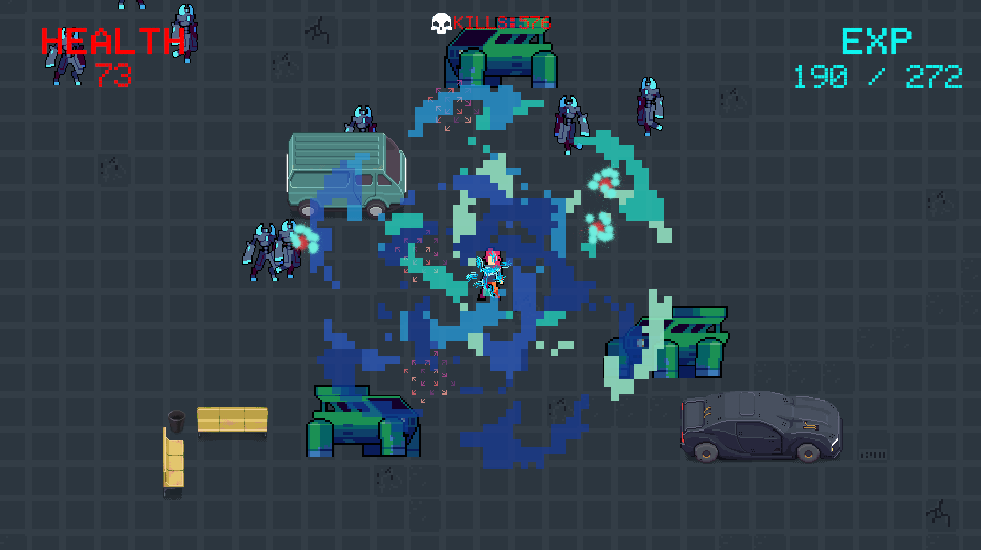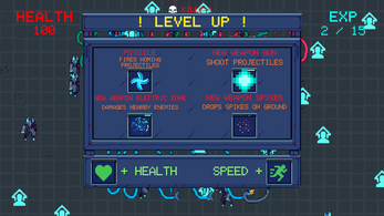 - The player can attack with different weapons and level up.