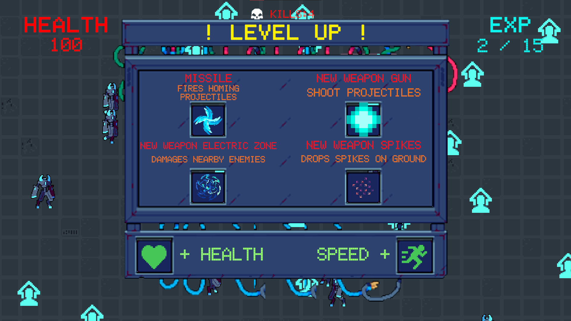 - Upon leveling up, you can choose to upgrade your current weapon or obtain a new one.